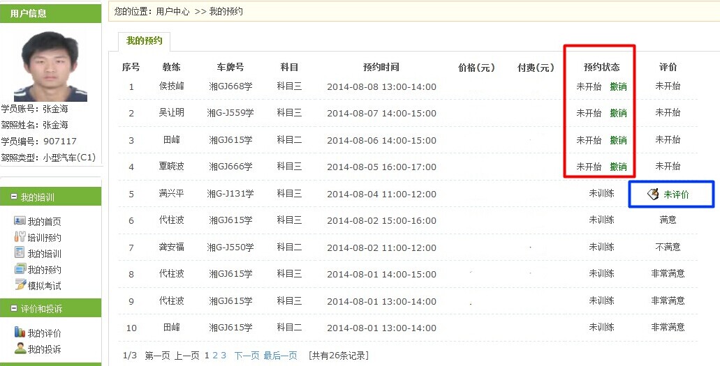 注:欠费不能再次预约,不评价教练不能再次预约。